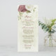 Beautiful romantic wedding menu card featuring dusty rose and white flowers and some pretty leaves .