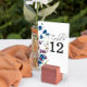 Elegant modern and stylish wedding table number card features foliage of dusty, royal blue, purple bloom wild florals and eucalyptus foliage.