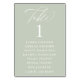 Elegant white calligraphy "table", with guest names listed and table number, wedding table number seating chart card. Background colour shown in dusty sage, can be customised. Designed to coordinated with our Dusty Sage Botanical Collection.