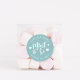 Punny wedding favour stickers feature "mint to be" in white hand lettered script accented with hearts, on a dusty teal aqua background. Personalise with your names and wedding date.
