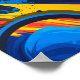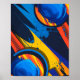 A vibrant abstract artwork featuring two large blue circles surrounded by energetic brush strokes in bright orange and yellow. Set against a deep navy background, the composition is enhanced with splashes of paint and diagonal streaks that create a sense of speed and motion. The bold contrast of colours and dynamic layout give the design a powerful, modern, and street-art inspired look.