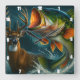 This square wall clock presents a vivid, action-packed scene of a majestic deer standing in water while a massive bass leaps dramatically towards it. The detailed artwork captures the raw energy of nature, making it an engaging and unique decorative piece for any outdoor enthusiast's home, cabin, or office.