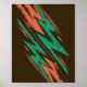 The artwork features a dark brown background with bold, jagged strokes of reddish orange and turquoise green intersecting in a dynamic, lightning-like pattern. Halftone dots and splattered textures enhance the edges, adding raw energy and intensity. The contrast between earthy brown, fiery orange, and vibrant turquoise green creates a striking, urban-inspired abstract composition that feels both aggressive and electrifying.
