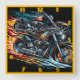 A striking motorcycle with vibrant flames speeds along a dark road, showcasing its power and thrill amidst an electrifying atmosphere.
