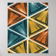 This design features a bold and energetic geometric pattern composed of overlapping triangles filled with radiant, brush-like streaks. The color palette includes orange, golden yellow, teal green, black, and white, creating a strong visual contrast. The triangles are arranged in a repeating grid with sharp, dynamic lines that give the impression of motion and vibrancy. The white background enhances the brightness of the colored shapes, giving the composition a clean yet powerful aesthetic. Overall, the design feels modern, expressive, and full of energy—perfect for contemporary decor, digital backgrounds, or graphic projects.