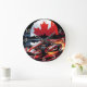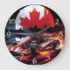A striking hot rod go kart speeds past a serene lake, set against a vibrant Canadian flag and glowing full moon, highlighting the thrill of racing in a picturesque setting.