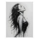 A tilted upward profile of a woman captured mid-motion, as if turning her head. Her hair trails behind in expressive ink strokes, complemented by dynamic vertical drips that emphasize movement and energy. The artwork vividly conveys a sense of motion, vitality, and spontaneous expression through bold ink techniques and fluid lines.