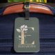 Letter E monogram floral. Letter E in golden brown texture accented with green watercolor compound leaves, flower blossoms and gold dust. Personalised with name in matching font.