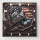 A detailed carving of a majestic eagle perched on a branch, set against a backdrop featuring mountains and the American flag.