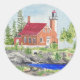 Eagle harbour lighthouse, watercolor painting by Kristina Anderson on a round sticker. This is an iconic lighthouse in Michigan's Upper Peninsula.