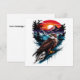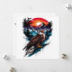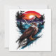 Digital illustration of a red-tailed hawk perched on a blue splattered rock. The hawk has detailed brown and white feathers, yellow talons, and a sharp yellow beak. Behind it, a vibrant sunset with a red-orange sky, silhouetted pine trees, and snow-capped mountains. The background features dynamic brush strokes and splatters, blending realism with abstract art styles. The overall color palette includes rich browns, whites, blues, and reds.