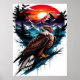 Digital illustration of a red-tailed hawk perched on a blue splattered rock. The hawk has detailed brown and white feathers, yellow talons, and a sharp yellow beak. Behind it, a vibrant sunset with a red-orange sky, silhouetted pine trees, and snow-capped mountains. The background features dynamic brush strokes and splatters, blending realism with abstract art styles. The overall color palette includes rich browns, whites, blues, and reds.