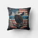 A majestic eagle stands on a tree branch, set against a background featuring mountains and the American flag.