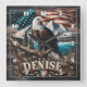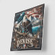 A majestic eagle rests on a branch, set against a backdrop of mountains and the American flag, symbolising strength and patriotism.