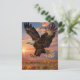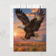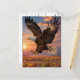 A majestic bald eagle soars through the sky at sunset, its wings spread wide against a backdrop of colourful wildflowers and a golden sky.