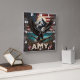 A majestic eagle stands on a branch with its wings spread wide, set against a backdrop of mountains and an American flag, symbolising strength and freedom.