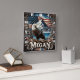 A regal eagle perches gracefully near a tranquil lake, framed by a mountain backdrop and accentuated by the American flag and forested