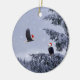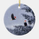 Bald eagles with Santa hats in a forest with snow on a ceramic Christmas ornament. Perfect for nature lovers!
