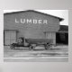 An early tractor trailer truck parked outside a lumber yard. 1925.