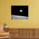 Apollo 8. This view of the rising Earth greeted the Apollo 8 astronauts as they came from behind the Moon after the lunar orbit insertion burn. Earth is about five degrees above the horizon in the photo. The unnamed surface features in the foreground are near the eastern limb of the Moon as viewed from Earth. The lunar horizon is approximately 780 kilometres from the spacecraft. Width of the photographed area at the horizon is about 175 kilometres. On the Earth 240,000 miles away, the sunset terminator bisects Africa.