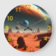 Pictured is the planet Mars with views of planet Earth, moon and Jupiter in this futuristic fantasy art design