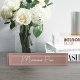 Elegant desk nameplate features your name, title, or choice of personalisation in white hand lettered cursive lettering on a neutral earth tone terracotta background.