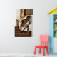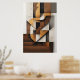 Abstract vertical composition with interlocking geometric shapes in shades of brown, ochre, black, and white. Texture reminiscent of aged paper and artistic collage. Sophisticated design ideal for modern and minimalist decor. Bring structural art and timeless elegance to your space.