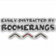 Funny sticker with the words Easily Distracted By Boomerangs, above a graphic design of 3 decorative boomerangs.
