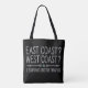 If you love swing dancing - both East Coast and West Coast - this graphic tote is for you! Grey text reads "East Coast? West Coast? I Swing Both Ways" in modern, weathered typography. Also included in the art are two arrows, pointing in opposite directions on either side of a light aqua star. Customise with your own additional personalisation or line of text below by using the easy, provided templates. If no additional text is desired, simply delete the placeholder text. A fun and funny bag to carry to social dances or to show your love of dance everyday.