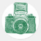 A sticker with a high contrast, high passed filtered and vectorised image of a vintage East German camera from the 1950s. Creating a strong bold toothy retro screen print. or mediaeval Gothic brass rubbing like effect.