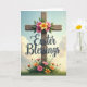 Designed with a rustic wooden cross at the center, the scene shows strong wood grain rising from thick green grass, like a steady presence in a spring field. Where the beams meet, a full bouquet spills outward, with pink daisy-like flowers and one golden-yellow bloom with a soft orange center tucked into deep green leaves. Near the base, more flower clusters in orange and pink dot the grass, their close spacing suggesting a gentle togetherness, like friends leaning in for a shared moment 🌷. Across the upper portion of the image, the words “Easter Blessings” appear in flowing dark lettering, set clearly against the open sky. The background fades from clear blue at the top to a warm golden glow near the horizon, adding a tender, affectionate warmth to the whole scene 🐇. Light touches the petals and the wood edges, giving the flowers a soft shine without overpowering the earthy textures. A few pale, sunlit clouds hover low near the horizon line behind the cross.