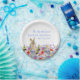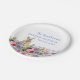 Modern colourful watercolor custom Easter brunch and egg hunt paper plates with cute Easter bunny sitting in a wildflower meadow. Add your family name using the easy to use templates and set the scene for a unique spring garden party. Spring flower illustrations include poppy, daisy, cornflower, forget me nots, cosmos with springtime foliage in vibrant bright colours including cornflower blue, navy blue, pink, purple, orange, green and yellow. Original artwork by artist Catherine Sweetman