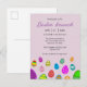 Colourful Easter eggs on a pink invitation to an Easter brunch and egg hunt.