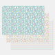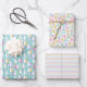A set of three Easter wrapping paper sheets with matching patterns in bright colors for your Easter celebration. White Easter bunnies hugging their delicious and colorful Easter eggs. lots of yellow baby chicks hatching from colorful eggs and surrounded by more Easter eggs. And a matching striped paper.