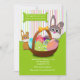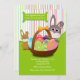 Whether you're having an Egg Hunt, a Birthday Celebration, or Easter Brunch this adorable invitation is perfect for the occasion. The background has a pastel-stripe pattern paired with a spring-green base which holds an Easter basket full of decorated eggs and two bunnies. The scroll on top can be made larger or smaller (+-) or eliminated.