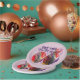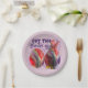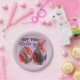 Paper plate fun design with Easter holiday theme, a colourful painted Easter bunny sitting next a big egg identically painted. The bunny has a round belly so it looks like he is an egg with a bunny disguise or an egg with big ears and short legs. It looks quite funny with the message "Got two Easter eggs". The painting pattern is a lovely combination of red, green, pink, purple, cyan and there are painting traces everywhere.