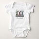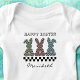 This playful Easter bunny baby bodysuit has a cute and playful checkerboard design with the rear profile of 3 cute bunnies and their cotton tails, decorated in a checkerboard pattern. Each bunny is a different color alternated with black squares: mint green, pink, and a soft blue-teal color. The text Happy Easter appears above the 3 bunnies in a playful font, with a strip of classic black and white -- or blank, if you order a colored bodysuit -- with your child's name in a pretty script font below. Make sure to type the name in the Personalize box.