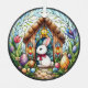 A beautiful stained glass Easter ornament of a bunny at a church surrounded by flowers and Easter eggs
