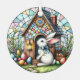 A beautiful stained glass Easter ornament of a bunny at a church surrounded by flowers and Easter eggs