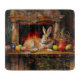 Easter bunny lounging in front of the fireplace with colorful Easter eggs