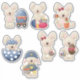 Seven adorable white Easter bunnies with floppy ears.