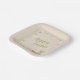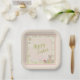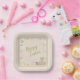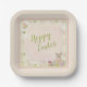 Easter holiday paper plates feature a whimsical Easter bunny surrounded by coloured Easter eggs. There are dainty pink flowers and greenery all around the napkin and then it's outlined in pale green and a pinky peach colour against a creamy tan background. In the centre it reads "Hoppy Easter", which is customisable should you want to change that.