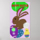 One-of-a-kind Holiday Easter Bunny Posters. Happy Easter is written in red text on a large green decorated egg. Centre of poster has a cute brown furry Easter Bunny rabbit with big pink ears and bushy cottontail, green white egg, blue dotted egg, pretty purple egg with green flower on a light purple background. Original Graphic Artwork by TamiraZDesigns. Visit my store for more original items www.zazzle.com/tamirazdesigns