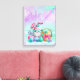 Easter Bunny Gnome with pink bunny ears sitting in spring flowers with decorated eggs and a wicker basket of carrots set on a watercolor teal and purple plaid background with pastel candy icing drips.