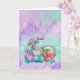 Easter Bunny Gnome with pink bunny ears sitting in spring flowers with decorated eggs and a wicker basket of carrots set on a watercolor teal and purple plaid background with pastel candy icing drips.