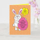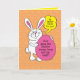 Cartoon illustration of a cute Easter Bunny holding an "eggstra" large Easter egg with a riddle on the egg. The answer is inside along with an "eggstra" special greeting. Copy can be changed.
