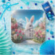 A cute white Easter rabbit peeks over a picket fence surrounded by colourful tulips and a bright spring garden.