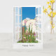 Open window and sheer curtains view of cute Easter bunny in grass and flowers for Easter greetings