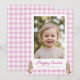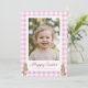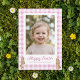 Celebrate Easter with a sweet and personal touch with this Happy Easter photo card, featuring a soft pink watercolor gingham design and adorable baby bunny accents. The front includes a large photo frame for your favorite picture, an adjustable “Happy Easter” greeting, and a customizable sender line, making it a lovely way to send a personalized Easter message to family and friends.