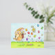 On this card, a beige easter bunny is hopping from right to left. He is carrying a basket on his back from which he takes easter eggs in all colours, that he drops into the grass as he passes by. From one of these eggs, a little chick is hatching mid-flight. It looks surprised and not too amused about the situation.